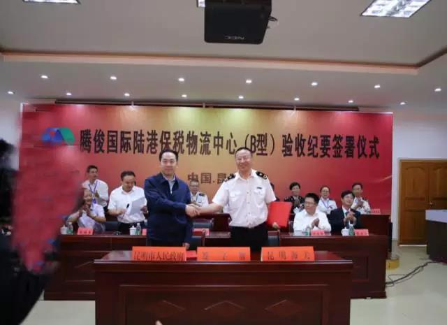 昆明海關(guān)副關(guān)長(zhǎng)馬軍與昆明市人民政府副市長(zhǎng)洪維智簽署了《騰俊國(guó)際陸港保稅物流中心基礎(chǔ)和監(jiān)管設(shè)施驗(yàn)收紀(jì)要》。昆明市人民政府高庚副秘書長(zhǎng)、晉寧區(qū)人民政府李福軍區(qū)長(zhǎng)、昆明市商務(wù)和投資促進(jìn)局徐增雄局長(zhǎng)、及省、市、區(qū)各級(jí)有關(guān)部門負(fù)責(zé)人參加了驗(yàn)收工作。