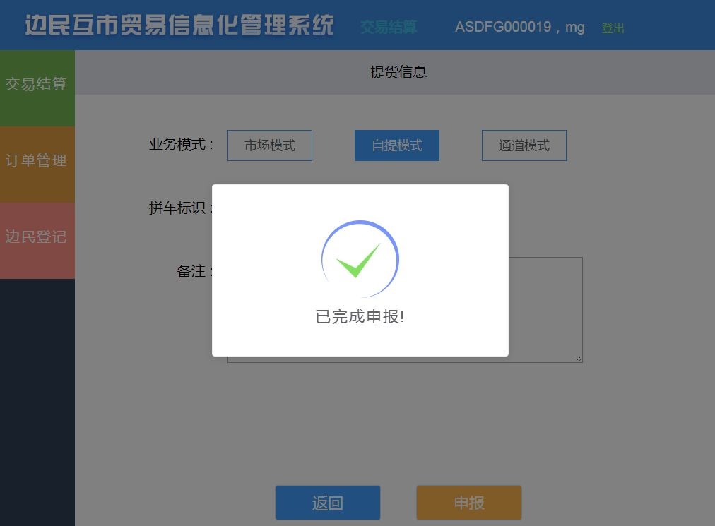 2019年6月3日,航通在滿洲里海關(guān)下轄、滿洲里中俄邊民互市貿(mào)易區(qū),順利完成航通邊民互市貿(mào)易區(qū)運(yùn)營管理平臺(tái)產(chǎn)品(簡稱“航通運(yùn)營管理平臺(tái)”)與總署非貿(mào)業(yè)務(wù)管理系統(tǒng)邊民互市貿(mào)易子系統(tǒng)(簡稱“總署互市統(tǒng)一版系統(tǒng)”)的聯(lián)調(diào)測(cè)試,打響海關(guān)總署互市統(tǒng)一版系統(tǒng)試運(yùn)行對(duì)接聯(lián)調(diào)的第一槍!
